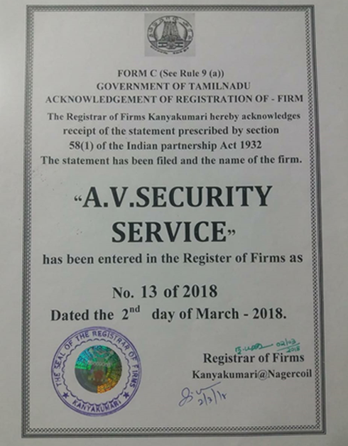AV Security Service, is a Government Registered Company with an experienced Management team of security guards. We take this opportunity to introduce “AV Security Service” as a Best Security Guard services Company to provide services to various spheres of life. Our concern “AV Security Service” takes pride in living up to its motto “Securing your Trust”. We not only go beyond providing security in the form of educated and professional personnel but also disciplined and trained staff whose skills are furnished and motivated to garner effective performance.